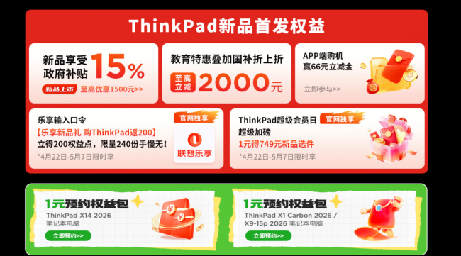 从量身打造的新品,到诚意满满的福利,本次 ThinkPad 2026 新品暨天禧 AI 生态发布活动,就是要为每一个用户,带来适配你的 AI 生产力新体验。想要解锁全部专属权益,抢先入手心仪的新品,进入联想官网平台参与本次活动,开启你的 AI 办公新旅程!