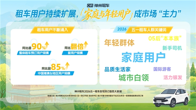随着租车使用场景的不断拓展,今年五一租车用户结构也在悄然变化。神州租车五一预订数据显示,整体租车预订用户规模同比增长超过90%,其中新用户增长实现翻倍。过去以商务与差旅需求为主的租车用户结构,正在逐步向家庭用户、年轻群体、城市白领及活力银发族等多元人群延伸。